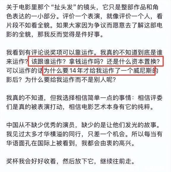 她还不停地用六个反问在质疑这个奖项的运作:“我真搞不明白,这到底是谁在操作啊?”这事儿该找谁搭伙啊?有钱就能搞运作吗?这还是资本调整吗?要是能运作,怎就等年才给我弄个威尼斯的影后呀?凭什么要给我办事,而不是别人呢?